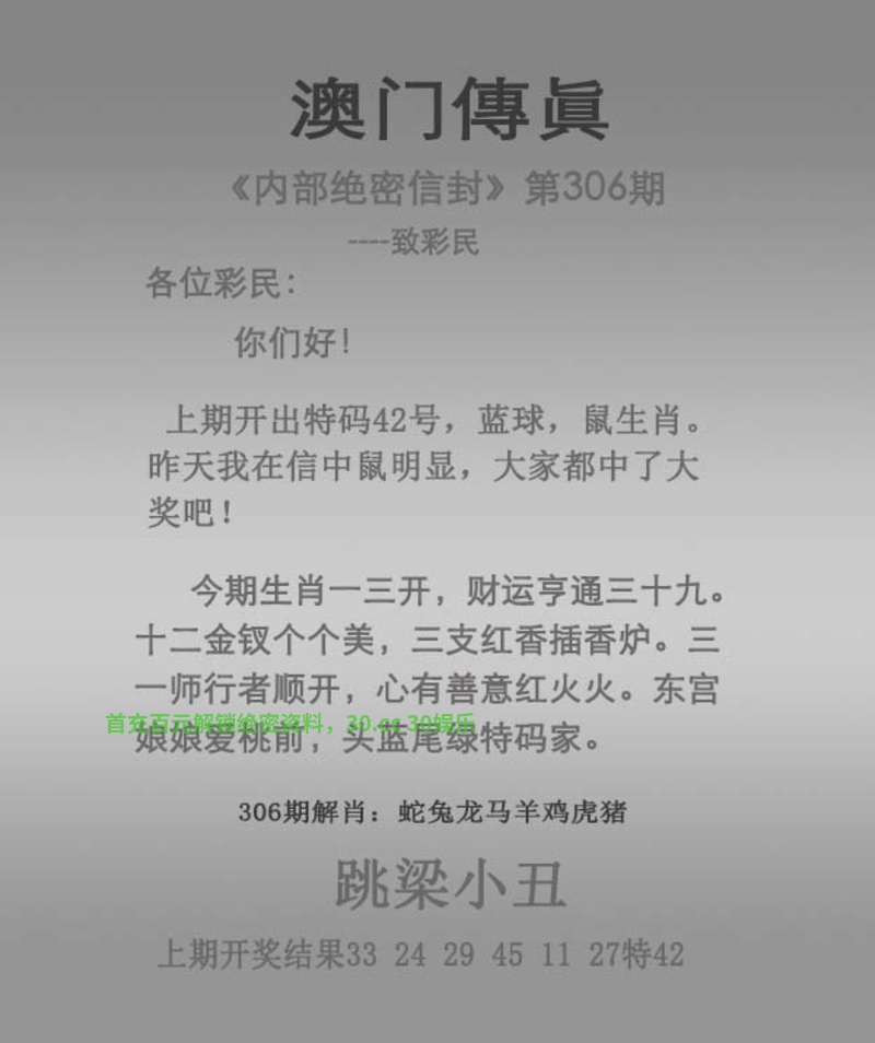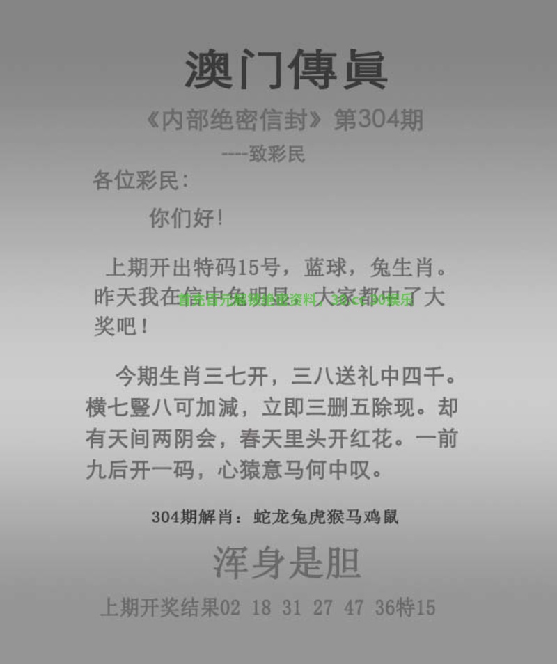 | 308期:独解传真 解:今期生肖二七开,老牛骑马倒着走。十二生肖我老大,一轮红日照天涯。三七开来合数双,江鲤也想跃龙门。花香鸟语成双对,金银财宝随手拿。 送:蛇牛马鼠龙虎猴狗 主特:25.29.24.18.14.04.46.32  |